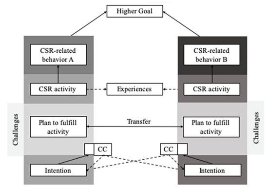 While in general, CSR and sustainability research do not offer any standardized set of questions for the necessary compilation of data, this research field also still lacks appropriate models as a theoretical basis for such studies. Hence, the Compensatory Carry-over Action Model (CCAM) by Lippke [100,101] was chosen as a theoretical basis to go beyond cognitions with the expectancy violation theory [98] and rather understand behavior related to concrete actions. Moreover, few theories exist on holistic approaches combining different actions or behaviors that address energy consumption and waste management as well as physical distancing and hygiene rules. However, only if such a holistic understanding is achieved modeling also changes over time, a successful improvement strategy can be initiated or maintained. At the same time, the CCAM model is versatile and can be easily adapted to CSR and sustainability practices (see Figure 2).