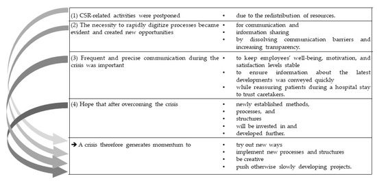 One major crisis in recent years was evidently the COVID-19 pandemic: It has been a strain on healthcare systems around the world. The discrepancy between the continuous provision of essential services, the adaptation to the challenges of resolving the pandemic, and the issues of governance during the pandemic are immense [59,60,61,62]. While many different sectors were affected by the COVID-19 pandemic, the healthcare sector was especially impacted because of the increased workload due to more patients and more required hygiene measures for patients, staff, and visitors [63,64]. “Due to the current outbreak of COVID-19, both public and private sector organizations are facing tremendous functional challenges” [65] (p. 1240) concerning changes in structures, processes, and workforce sustainability. The current circumstances force organizations to “alter their workforce in technical, physical, and socio-psychological ways not seen before” [66] (p. 183), posing great obstacles to the standard way of doing business. The changes are extensive and call for concurring strategic management and leadership as well as crisis management and crisis communication [67,68,69,70,71,72,73,74,75,76,77,78,79]. This paper aims to review the crises of the COVID-19 pandemic empirically and apply a theoretical backdrop to highlight the connection and relationship to CSR.