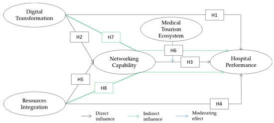 According to Bulatovic and Iankova [10], governments, health service providers, and tourist organizers must work together to grow medical tourism. Lack of cooperation between medical tourism facilitators and doctor’s offices is one of the obstacles to the development of medical tourism [63]. Actors in the business ecosystem can actively and passively introduce and utilize diverse sorts of resources to produce value for themselves and other ecosystem actors [24]. According to research on medical tourism in Malaysia, most cooperation between health care providers and tourism companies in Malaysia are also informal, despite the fact that they want to exploit medical tourism for commercial expansion [64]. The development of medical tourism requires strong cooperation amongst all medical tourism ecosystem stakeholders [38]. According to the previous study’s conclusions, hospital performance will not improve upon growing medical tourism if there is no supporting ecosystem and its organizers lack networking skills. Based on the findings of prior experiments, the authors of this paper generated the following hypothesis: