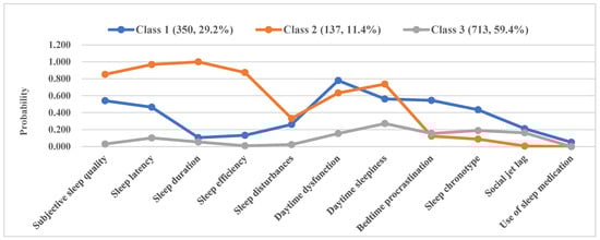 As shown in Figure 1, class 1, class 2, and class 3 included 350 (29.2%), 137 (11.4%) and 713 (59.4%) participants, respectively. The abscissa is the 11 binary sleep indicators, and the ordinate is the probability that each class of people choose the worse one among the binary sleep indicators. Class 1 had the highest probability of severe bedtime procrastination, high SJL, night sleep chronotype, severe daytime dysfunction and use of sleep medicine, and moderate probability of poor subjective sleep quality, long sleep latency, severe sleep disturbances and daytime sleepiness; this class was designated as “circadian disruption with daytime dysfunction”. Class 2 had the highest probability of poor subjective sleep quality and sleep efficiency, long sleep latency, short sleep duration, severe sleep disturbances and daytime sleepiness, and moderate probability of daytime dysfunction, and was designated as “poor sleep status with daytime sleepiness”. Class 3 had a relatively favorable sleep status and was designated as “favorable sleep status”. There were significant differences in each dimension of sleep among the three sleep patterns, which showed great discriminative validity and further proved the accuracy of classification (Supplementary Table S2).