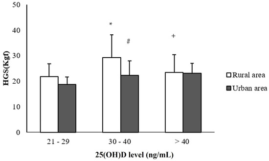 Distribution of older adults in the rural and urban areas according to handgrip strength and 25(OH)D levels. # Statistical difference between the groups of older adults in the rural versus urban areas, considering the same level of 25(OH)D, p < 0.05. * Statistical difference in relation to the group with levels from 21 to 29 ng/mL, considering the same area of residence, p < 0.05. + Significant differences, p < 0.05, in relation to the 30 to 40 ng/mL group, considering the same area of residence. The differences were analyzed using the ANOVA test, followed by the Tukey’s test. The group with 21 to 29 ng/mL: n = 10 rural area and n = 9 urban area; the group of 30 to 40 ng/mL: n = 22 rural area and n = 26 urban area; and the group > 40 ng/mL: n = 9 rural area and n = 8 urban area. # p < 0.001; * p < 0.02; + p < 0.02.