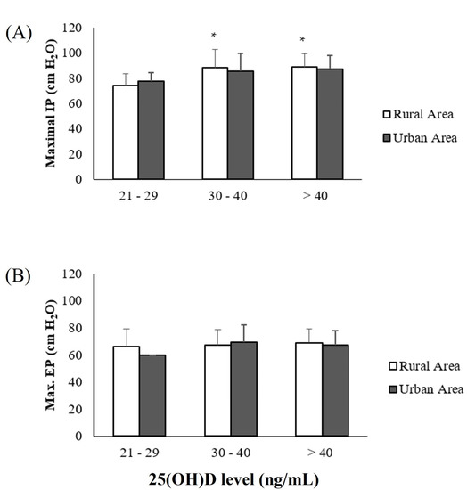 Distribution of older adults in the rural and urban areas according to maximal inspiratory and expiratory power pressures and levels of 25(OH)D. (A) Maximal inspiratory force (MIP) in cm H2O, and (B) maximal expiratory force (MEP) in cm H2O. * Statistical difference between the level of 25(OH)D in relation to the group with 21 to 29 ng/mL, considering the same area of residence, p < 0.05. The differences were analyzed using the Mann–Whitney variance test. A—MIP = * p= 0.02—rural area group: 30 to 40 × 21 to 29 ng/mL and p = 0.02 > 40 vs. 21 to 29 ng/mL.