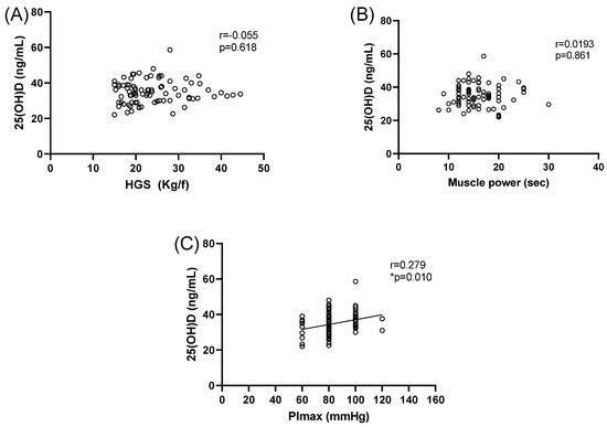 Pearson’s correlation between 25(OH)D concentrations and handgrip strength (HGS) (A), 25(OH)D concentrations and muscle power (B), and 25(OH)D concentrations and PImax (C). Pearson correlation test. * p < 0.05.