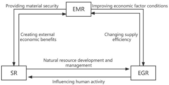 Economic resilience (EMR) provides a basic material guarantee for the development of society in many ways. In return, the enhancement of social resilience will improve the conditions of economic factors and contribute to the advance of economic resilience. Economic development is a prerequisite for urbanization and provides material security for the urbanization process, while the benefits of intra-city coordination brought by urbanization boost economic growth [19]. The population age structure and population size affect the economy mainly through three paths—investment, import and export trade, and consumption. In addition, increased social resilience (SR) contributes to the consistent improvement of residents’ living quality, thus driving further economic activities [20]. In line with this, economic development affects regional fertility rates and socio-cultural values, and changes in population size ultimately affect economic resilience [21]. Economic resilience and ecological resilience react and compete against each other. Economic resilience negatively affects ecological resilience in localized areas in the form of the spatial agglomeration of capital and labor [22].With the further growth of the economy, economic resilience provides more material support for the restoration of the living environment to enhance ecological resilience (EGR) when resources and ecological endowments limit a faster pace of economic growth. Therefore, ecological resilience can also affect economic resilience by changing supply efficiency. The ecological environment is interconnected with political culture. Some scholars have proposed a pressure-pulse dynamics (PPD) framework for long-term socio-ecological systems research, holding some conventional ecological changes (e.g., fire, drought) and long-term slow changes (e.g., changes in land use types) act together to alter the structure of biological species and ecological functions. In this way, ecosystem services (including food and carbon cycling) are affected, ultimately altering human actions, which in turn leads to ecological changes [23].