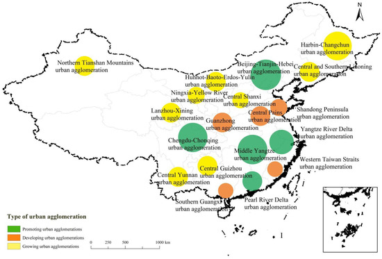 The concept of urban agglomeration is derived from the theory of metropolitan interlocking region proposed by French economist Gottmann in 1957 [16]. It is a high-end development form that emerges when the regional urbanization reaches a high level, and the highest level of spatial organization in the mature stage of urban development—specifically, a huge, multi-core and multi-level, continuous urban agglomeration formed by a regional central city, or one or two relatively sub-level megacities, as the core [17]. The development of urban agglomerations has become a significant symbol, widely used globally, to measure the level of economic and social development of a country, representing the region’s competitiveness and the level of industrial intensification and chain development [18]. The current urban agglomerations, as organic complexes for coordinated development, can drive the growth of their regions. Thus, they will focus on future development planning for different regions.