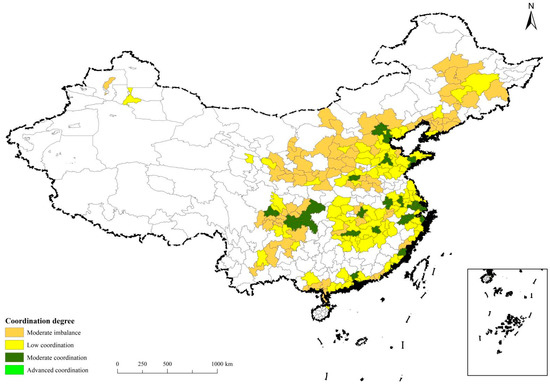 The coupling coordination degree of economic-social-ecological resilience of China’s urban agglomerations is proportional to their positioning, and the mean coupling coordination degree of economic-social-ecological resilience ranges from moderate imbalance to low coordination. Regarding spatial distribution, areas with advanced coupling coordination were mainly distributed in promoting urban agglomerations. Growing urban agglomerations have the lowest mean value of coupling coordination which coincides with the findings of another study [20], see Figure 5.