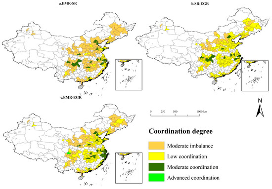 where, C represents the coupling degree with a value in the range of 0–1; , and are the scores of EMR, SR and EGR, respectively.