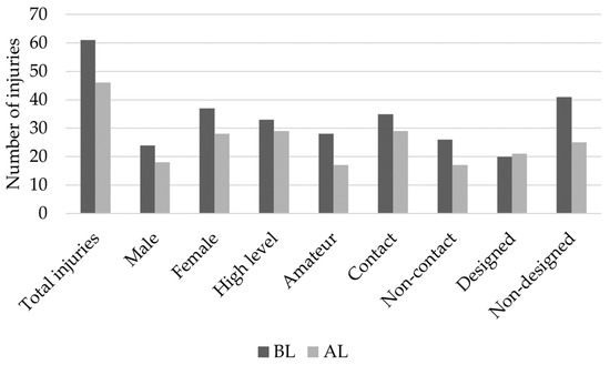 The descriptive statistics for each level analyzed are shown in Table 2, and the total number of injuries and IRs for the levels BL and AL of the athletes are shown in Figure 1.