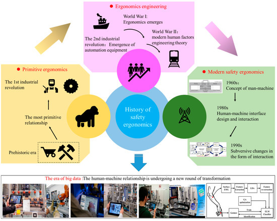 The history of safety ergonomics has experienced a long development process. According to the development of system efficiency and relationships between humans and machines, the development of safety ergonomics can be summarized into three development stages: primitive ergonomics, ergonomics engineering, and modern safety ergonomics [10]. Since the beginning of human society, a simple interactive relationship has been formed between humans and machines [11]. In prehistoric times, to meet the survival conditions, humans enhanced their survivability by manufacturing tools. The initial and most primitive relationship between humans and machines was formed. After the industrial revolution at the end of the 18th century, labor-intensive and industrial-aggregating operations were advancing at a high speed, traditional manual manufacturing could no longer meet the development needs for productivity, and the requirements for tool reform became increasingly urgent. With the rapid advancement of mechanical physics research, early mechanized equipment was widely used in production and life. The development of electric power (the second industrial revolution) has greatly increased the number and types of production tools and equipment. To a certain extent, it also reduced the labor load of the personnel in the production system and increased the production efficiency of machines [12]. The First World War objectively promoted the development of ergonomics, and with the outbreak of the Second World War, the relationship between humans and machines gradually changed from "humans adapting to machines" to "machines adapting to humans," which also formed the theory of modern ergonomics engineering [13]. Since the 1950s, ergonomics has developed rapidly worldwide. However, safety issues in production have gradually emerged with the improvement of work efficiency [14]. In 1960, the concept of man-machine symbiosis was first proposed [15]. In the 1980s, the design of the interface and the method of interactive operations increasingly became a mainstream research direction [10,16,17]. In the 1990s, computer technology gradually matured, and computers slowly became a tool of control for manipulating complex production systems, and the process of mechatronics was accelerated [18]. Computer technology has changed the interaction forms and effects between traditional humans and machines, and it has accelerated the cognitive process of intelligent humans [19,20,21]. The human–machine relationship is also undergoing a new round of transformation, which provides a rare historical opportunity for the transformation and upgrading of safety ergonomics. The development history of ergonomics is shown in Figure 1.