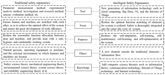 With the development of information technology, especially in the context of big data, audio, video, and other massive data "blowout" growth [51], a wide range of data collection covers various fields of safety ergonomics research and human–machine–environment system data perception, and the processing technology is more intelligent; the internal data structure is also broader and more diverse. The differences between traditional safety ergonomics and ISE can be summarized in Figure 4.