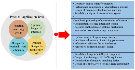 (3) The purpose of any new subject is to solve practical problems. As far as ISE is concerned, the purpose of its practical application is to identify critical risk system information by identifying the failure and fault state of the system and to carry out safety control activities through intelligent monitoring, intelligent detection, and intelligent prediction. The practical application level of ISE contains many fields; specifically, it includes functional matching design for humans and machines, the optimal design of an intelligent interface, optimal intelligent design for work efficiency, and optimal intelligent design for intrinsic safety, etc. By carrying out research work at the practical application level, the risk level of the human–machine–environment system is converged, and then measures are provided for achieving the intrinsic safety and cleaner production of system. Practical application level of ISE as shown in Figure 7.
