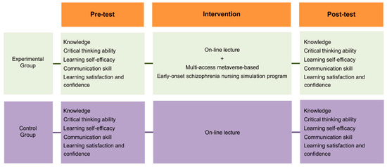 This study developed a multi-access metaverse-based early onset schizophrenia nursing simulation program using a quasi-experimental design. Its effectiveness was tested using a nonequivalent control group pre-test/post-test design. Knowledge, critical thinking ability, learning self-efficacy, communication ability, and learning satisfaction and confidence were set as outcome variables (Figure 1).