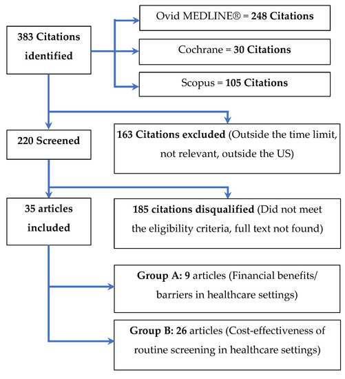The search identified 383 Citations; we screened 220 and excluded 163 (outside the time limit, irrelevant, or outside the U.S.). Of the 220 screened articles, we included 35 and disqualified 155 (did not meet the eligibility criteria)—refer to Figure 1.