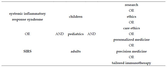The search algorithm combined the following keywords: “systemic inflammatory response syndrome” or “SIRS” with the keywords “children” or “pediatrics” or “adults” and “research” or “ethics” or “care ethics” or “personalized medicine” or “precision medicine” or “tailored immunotherapy”. The search used different combinations of keywords and accounted for variations in terminology. For example e, we searched with both the keyword “SIRS” and the exact phrase “systemic inflammatory response syndrome”. Likewise, we searched with both keywords “children” and “pediatrics” as well as with “personalized” and “precision medicine” (Figure 1).