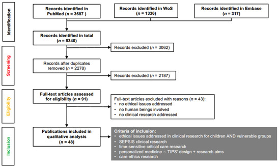 For the purpose of our analysis, we began with a systematic literature search to identify the key themes for evaluating ethical implications in the clinical research and therapy of SIRS in pediatric populations. The search was carried out in the databases of scientific literature PubMed, Embase and Web of Science. The goal of the search was to identify publications that address ethical challenges and issues in the research and therapy of SIRS in children. Due to the dearth of literature assessing ethical aspects in the treatment of SIRS in children, no time frame was given in the first place. The research protocol followed the recommendations for conduct and reporting of systematic literature reviews [14].