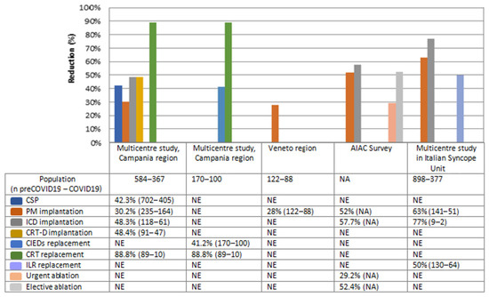 A retrospective multicenter study [4], carried out in Campania region, the most-populous region of Southern Italy with about 5.8 million residents, showed a significant reduction in the rate of all cardiac implantable electronic devices (CIEDs) implantations and in cardiac resynchronization therapy (CRT) and device replacements (p-value < 0.05), more likely because of the reduction in planned hospitalizations following Italian government measures to contain SARS-CoV-2 in-hospital diffusion. No significant differences in both pacemaker (PM) and implantable cardiac defibrillator (ICD) replacement procedures (p-value 0.297 and 0.076, respectively) have been shown, more likely because of the increase in urgent unplanned hospitalizations. The increased use of remote monitoring (RM) to optimize the hospital admission time during COVID-19 lockdown for CIEDs recipients may explain these data [5,9].