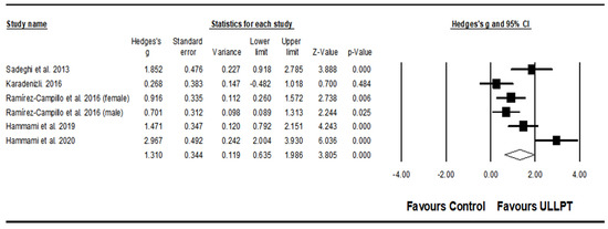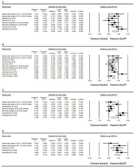 Following previous relevant research [22,35], three or more studies providing baseline and follow-up data for the same parameter were meta-analyzed. Based on pre- and post-intervention performance means and standard deviations, between-group effect sizes (ES; Hedge’s g) were computed (SD). The data were standardized using the post-score SD. Meta-analyses used the inverse-variance random-effects model because it allocates proportionate weights to trials based on their standard errors [43] and accounts for heterogeneity across studies [44]. If the needed information was not available in the original article or additional materials, the authors were contacted. If contact was not returned or data were unavailable, the paper was not included in the meta-analysis. The ES values are displayed alongside 95% confidence intervals (CIs), and were interpreted as follows: trivial, <0.2; small, 0.2–0.6; moderate, >0.6–1.2; large, >1.2–2.0; very large, >2.0–4.0; extremely large, >4.0 [45]. For studies with multiple ULLPT groups, the control group was often split into equal halves to facilitate inter-group comparisons [46]. The Comprehensive Meta-Analysis software (version 3; Biostat, Englewood, NJ, USA) was used to analyze all of the available data.
