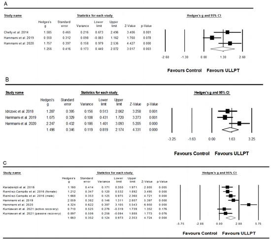 Forest plot of changes in 5 m sprint performance (A) [32,56,63], 20 m sprint performance (B) [32,62,63], and 30 m sprint performance (C) [32,58,60,63,64], in athletes participating in combined upper and lower limb plyometric training (ULLPT) compared to controls. Values shown are effect sizes (Hedges’s g) with 95% confidence intervals (CI). The size of the plotted squares reflects the statistical weight of the study.