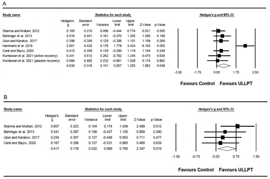 A significant, moderate effect of ULLPT was observed on upper body muscle strength (e.g., handgrip) (ES = 0.63; 95% CI = 0.07–1.25; p = 0.048; I2 = 77.7%; Egger’s test p = 0.686; n = 198; Figure 4A). The relative weight of each study in the analysis ranged from 12.57% to 15.83%. Moreover, a significant, small effect of ULLPT was noted on lower body muscle strength (e.g., leg press) (ES = 0.42; 95% CI = 0.07–0.77; p = 0.019; I2 = 0.00%; Egger’s test p = 0.330; n = 124; Figure 4B). The relative weight of each study in the analysis ranged from 20.0% to 30.29%.