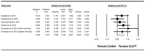 A significant, small effect of ULLPT was observed on flexibility performance (ES = 0.48; 95% CI = 0.15–0.81; p = 0.004; I2 = 0.00%; Egger’s test p = 0.139; n = 143; Figure 6). The relative weight of each study in the analysis ranged from 9.1% to 22.0%.