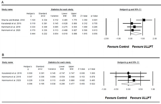 A non-significant, trivial, small effect of ULLPT was noted on static balance performance (ES = 0.44; 95% CI = −0.01–0.90; p = 0.056; I2 = 46.6%; Egger’s test p = 0.780; n = 141; Figure 7A) and dynamic balance performance (ES = 0.10; 95% CI = −0.29–0.49; p = 0.622; I2 = 00.0%; Egger’s test p = 0.880; n = 101; Figure 7B). The relative weight of each study in the analysis ranged from 6.9% to 13.3%.
