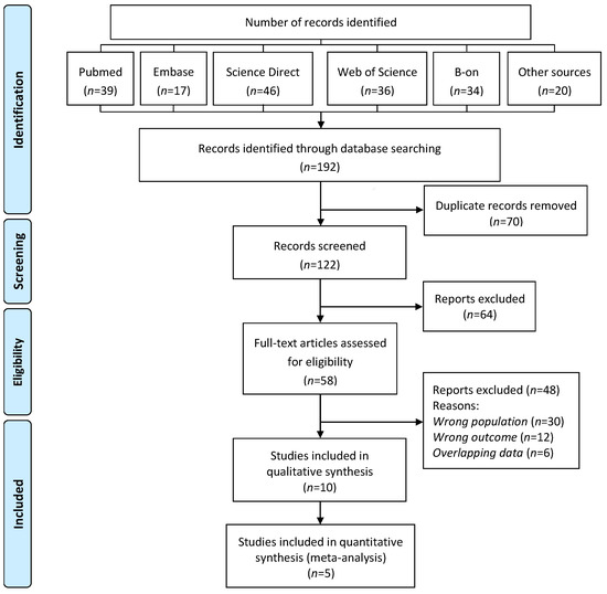 Figure 1 depicts the PRISMA flowchart used for the selection process. The initial database search retrieved 192 articles, with 122 remaining after duplicates were removed. Studies were then eliminated based on their title and/or abstract. The full texts of the remaining 58 publications were carefully reviewed and selected according to the inclusion and exclusion criteria. Finally, ten articles that fulfilled the eligibility criteria were included in the present work for qualitative analysis and five for meta-analysis (Figure 1).