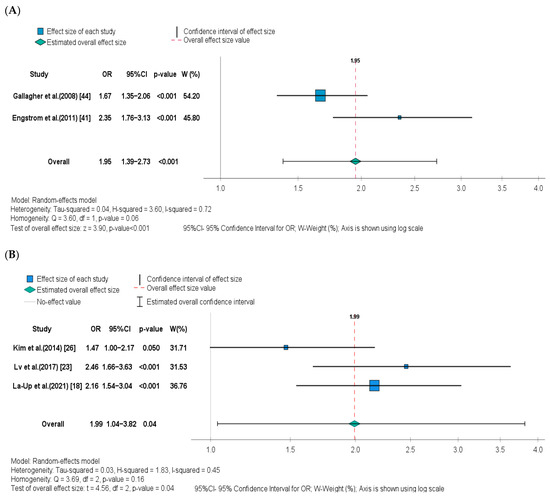 Forest plot and pooled effect estimates of the association between UCd levels and risk of osteoporosis in the (A) low-level Cd exposure group [41,44], and (B) high-level Cd exposure group [18,23,26].