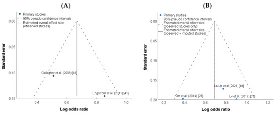 There was no evidence of publication bias for the studies included in meta-analysis as illustrated by the symmetrical distribution of funnel plot tests (Figure 3A,B, respectively). In addition, the Egger’s test also shows no publication bias (p = 0.17) for the studies included in the high-level exposure group (Supplementary Table S3). Because only two studies were included in the low-level exposure group, Egger’s test could not be performed.