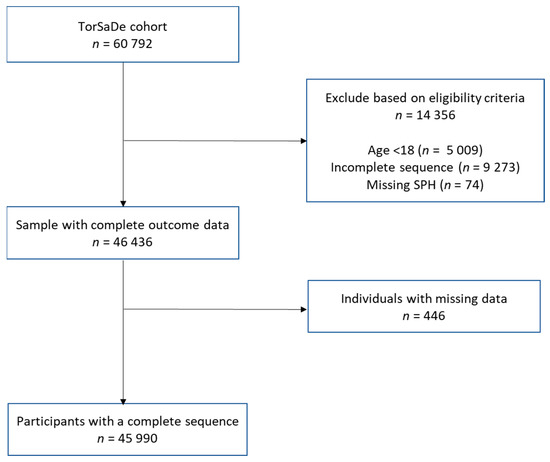 This study was conducted with 68,268 participants from Phase 1 of the TorSaDE cohort. Of these, 60,792 individuals agreed to have their data linked. For individuals with more than one CCHS participation, only the most recent participation was retained. Our sample was composed of a subpopulation of adults (aged 18 years and older) with complete residential location information. Participants with missing data on SPH reporting (n = 74) and the analytic covariable (n = 446) were excluded (Figure 1).