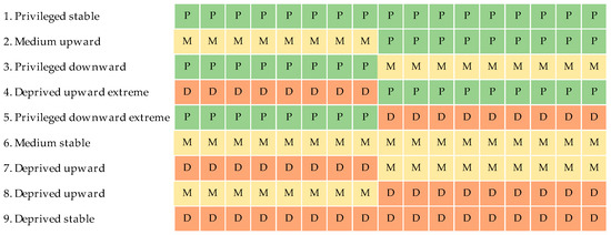 Theoretical sequences of neighborhood deprivation trajectories based on the tercile of annual deprivation. Notes: Privileged (P), Medium (M), Deprived (D).