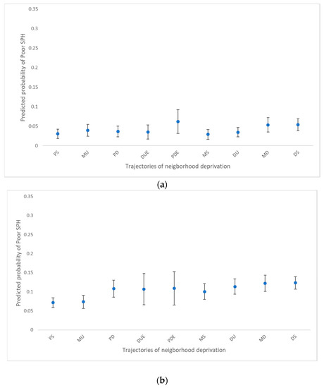 The age-stratified analysis allowed further examination of the life stages in which the association between NDTs and SPH was the most evident. Significant differences in age groups were also observed. No difference in the predicted probabilities of poor SPH was observed across NDTs among the younger age group (18–39 years). However, among participants aged >40 years, the results suggest that neighbourhood deprivation is an important predictor of SPH. The magnitude of this association was higher in adults aged ≥ 65 years.
