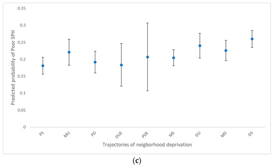 Predicted probability of poor SPH over neighbourhood deprivation trajectories (NDT) by age group (a) under 40 years, (b) 40–64 years, (c) over 65 years. Notes: predicted probability of SPH is shown on the y-axis and deprivation trajectories group is shown on the x-axis. Error bars on graphs indicate 95% confidence intervals. Privileged Stable (PS), Medium Upward (MU), Privileged Downward (PD), Deprived Upward Extreme (DUE), Privileged Downward Extreme (PDE), Medium Stable (MS), Deprived Upward (DU), Medium Downward (MD), Deprived Stable (DS).