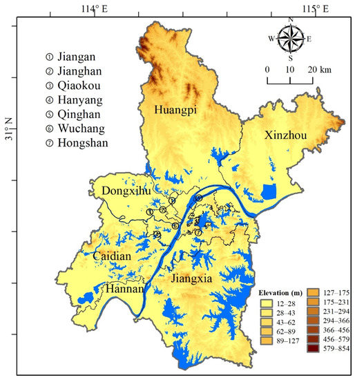 Wuhan City (Figure 1) is located in the central region of China, located in the east of Hubei Province, between 29°58′–31°22′ north latitude, and 113°41′–115°05′ east longitude. Wuhan City is the capital of Hubei Province, the only sub-provincial city of six central provinces, the central city of central China, and the core city of the Yangtze River Economic Belt. Located in the eastern part of Jianghan Plain, Wuhan enjoys unique and thick water owing to its ecological advantages. It has numerous rivers and lakes in the city, and is well equipped with natural resources such as mountains, rivers, forests, fields, and lakes. There are 446 mountains, and the water area accounts for approximately a quarter of the total area of the city [20,44,45].