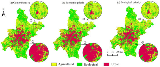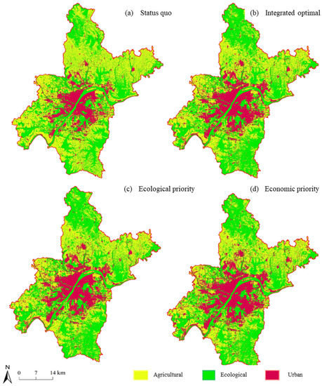 In this study, based on the 67 Pareto optimal solutions obtained by NSGA II, three solutions with the largest sum of economic benefits, the largest sum of ecological benefits, and the largest total comprehensive ecological and economic benefits were selected as the results of quantitative optimization (Figure 2 and Table 4). The results of land-use quantity optimization in Wuhan City under economic priority, ecological priority, and comprehensive consideration of economic and ecological benefits are presented, respectively. In addition, the simulation results of the spatial layout were obtained based on the FLUS model. Finally, according to the three types of spatial classification system constructed, the land-use optimization results were transformed into three types of spatial optimization results, and the land space layout optimization method of Wuhan was obtained.