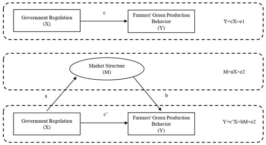 In Equation (2), reflects the total effect of government regulation on farmers’ green production behaviors. In Equation (3), is the influence of government regulation on the market structure of the intermediary variables. Finally, both government regulation and market structure are included in the regression equation to represent their impact on farmers’ green production behaviors. In Equation (4), and represent the direct impact of government regulation and the market structure on farmers’ green production behaviors, respectively.