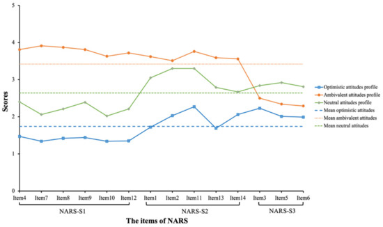 As expected, three distinct subgroups regarding attitudes toward robots in healthcare were identified in this study, suggesting that these participants had either optimistic, neutral, or ambivalent attitudes toward robots in healthcare. Firstly, respondents in Profile 1 (optimistic attitudes profile) reported the lowest scores on all three NARS dimensions, indicating that participants in this profile had the most positive attitudes toward robots in healthcare. Secondly, almost half (47.2%) of participants in Profile 2 (neutral attitudes profile) scored moderately on all 14 items of the NARS, reflecting their neutral attitudes toward robots. This might be because the vast majority (75.9%) of participants in this study had no actual experience with robots in healthcare, and thus their attitudes toward robots in healthcare could not be effectively evaluated.