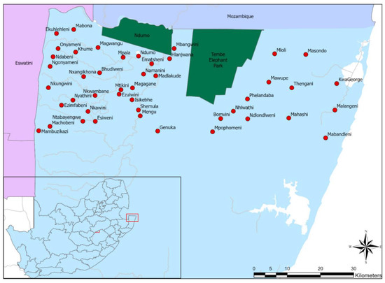 This study was conducted in two local municipalities; Jozini (Latitude: −27.429366, Longitude: 32.065107) and uMhlabuyalingana (Latitude: −27.1894900, Longitude: 32.5612000) of the Umkhanyakude District in the far north-eastern part of KZN province. It has a hot and humid tropical climate with most of the rainfall falling in summer, between December and March. The study area includes floodplains and pans, with two major rivers, the Phongolo and the Usuthu rivers [18]. The district is among the poorest in the country, with the second-highest socio-economic deprivation index in South Africa [19] and it is estimated that more than 82% of households live below the poverty line [20]. The Zulu ethnic group is predominant in the study area. The indigenous Nguni cattle breed and indigenous “Zulu” goats are the most common livestock in this area [21]. The majority of the farmers rely on livestock rearing on communal land for a living and relatively few practice crop farming.
