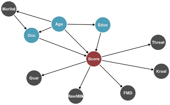 Hypothesized causal pathway for influential variables identified by random forest and their relationship with the outcome (knowledge score). The red circle indicates the outcome (knowledge score), blue circles (which were then included in the regression analysis) are variables hypothesized to directly affect the outcome, and gray for other variables. Marital = marital status; Quar = quarantine practiced; Rawmilk = consumes raw milk; FMD = agrees with the FMD animal movement policy; threat = consider that animal diseases present a threat to livelihood; Kraal = practice kraaling(housing) livestock adjacent to their house; Educ = education level; Age = age group; Occ = occupation.