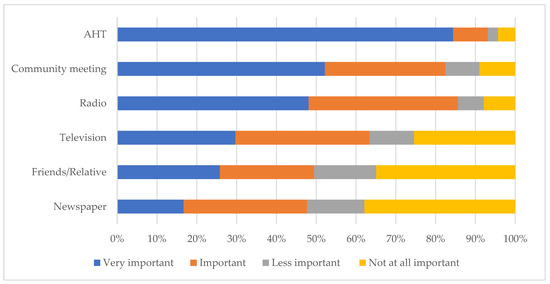 Based on the four-point Likert scale responses of the farmers, AHTs were mentioned by 84.4% of farmers (418/493) as their most important source of information and preferred means of communication, followed by community meetings (52.2%; 238/456) and radio (48.1%; 213/443) (Figure 3).
