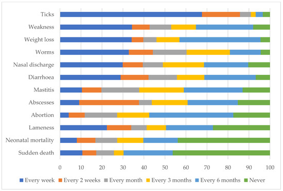 The most frequently seen livestock condition identified by farmers was tick infestation, followed by weakness, weight loss, worms, nasal discharge, and diarrhea. All conditions except sudden death, neonatal mortality, mastitis, abscess, and abortion, were observed by at least 50% of the farmers every week (Figure 4).