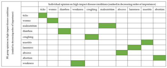 The relationship between individual and PE group survey opinions of Livestock farmers on common diseases condition with high impact in far northern KwaZulu-Natal. The green color indicates the agreement between opinion of the two groups.