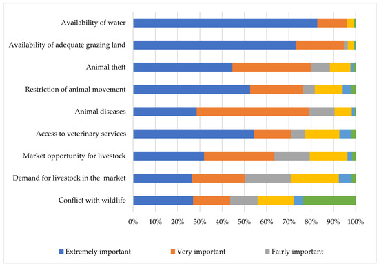 The availability of water was identified by the majority of the livestock keepers as an extremely important challenge, followed by the availability of grazing land, animal theft, restriction of animal movement, animal diseases, and access to veterinary services (Figure 7). Interestingly, animal theft was considered a greater challenge than animal diseases.