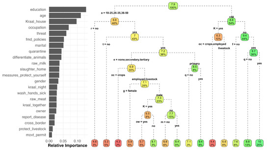 The RF analysis explained 30.92% of the variance in the model prediction of knowledge score, with the three most influential variables being education, age and kraaling livestock adjacent to the house (Figure 8). CART provided an overall representation of the expected animal diseases knowledge score depending on the different combinations of variables. For example, for respondents <50 years old who did not practice disease reporting, the expected score was 4.5; in contrast, for respondents >50 years old, who did not practice kraaling livestock adjacent to the house, agreed with FMD animal movement policies and quarantined new animals, the expected knowledge score was 10 (Figure 8).