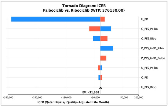 Tornado diagram of the univariate sensitivity analyses and their impact on ICER. The blue color represents the parameter, whereas the red color represents the ICER. U_PD: utility value of the ‘progressed disease’ health state; C_PFS_Palbo: cost of the ‘progression-free survival’ health state for the ‘palbociclib’ treatment group; C_PFS_Ribo: cost of the ‘progression-free survival’ health state for the ‘ribociclib’ treatment group; P_PFS_toPD_Ribo: transition probability from the ‘progression-free survival’ health state to the ‘progressed disease’ health state for the ‘ribociclib’ treatment group; P_PFS_toPD_Palbo: transition probability from the ‘progression-free survival’ health state to the ‘progressed disease’ health state for the ‘palbociclib’ treatment group; U_PFS_Palbo: utility value of the ‘progression-free survival’ health state for the ‘palbociclib’ treatment group; U_PFS_Ribo: utility value of the ‘progression-free survival’ health state for the ‘ribociclib’ treatment group; C_PD: cost of the ‘progressed disease’ health state.