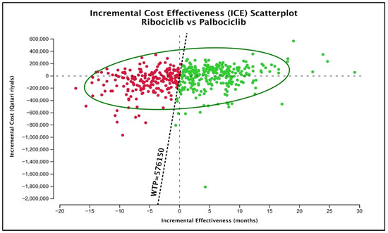 ICE plot of ribociclib versus palbociclib. Green dots represent the scenarios favoring ribociclib over palbociclib at a 3 GDP WTP of QAR 576,150.