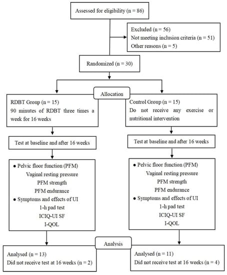 This randomized controlled trial was conducted at the laboratory of Women’s Sports and Health Research, Beijing Sport University, China (Figure 1). The study was approved by the Sports Science Experimental Ethics Committee of Beijing Sport University (2021054H). The laboratory of Women’s Sports and Health Research, Beijing Sport University, carried out web-based randomization, with all eligible participants assigned in a ratio of 1:1 to either the RDBT group (n = 15) or the control group (n = 15). Randomization was based on the severity of urinary incontinence, the number of births (one or two times), and the number of vaginal deliveries (one or two times) to prevent any effect on outcomes of an uneven distribution over the group allocation. Group allocation was relayed to participants by WeChat. Participants and study personnel involved in administering interventions could not be masked to group allocation. However, clinicians who performed the PFM assessment at baseline and 16 weeks were masked.