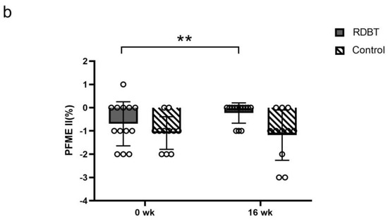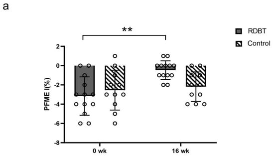 Percentage changes in pelvic floor muscle endurance (PFME, indicating how long the pelvic floor muscles continue to contract) of class I (a) and class II (b). The circles represent the individual values. ** p < 0.01 was considered statistically significant between baseline and postintervention in the RDBT group.