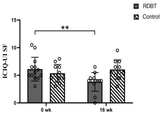 Change in the ICIQ–UI SF score. The circles represent the individual values. ** p < 0.01 was considered statistically significant between baseline and postintervention in the RDBT group.