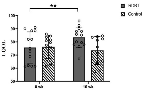 Change in the I—QOL score. The circles represent the individual values. ** p < 0.01 was considered statistically significant between baseline and postintervention in the RDBT group.