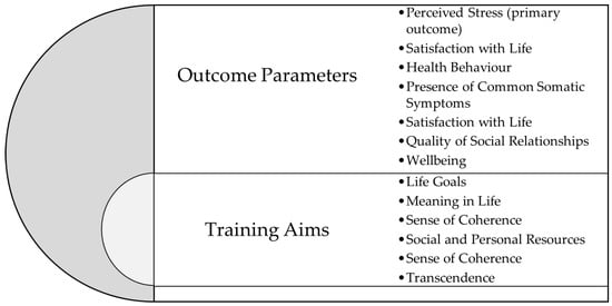 A training programme could hold the chance for higher sustainability of its effects, if it provides improvements for mind, body, and the social aspects in a person’s life. Established concepts have been selected and assigned to each of these aspects. As shown in Figure 1 for the “mind”-aspect life goals, meaning in life, satisfaction with life, sense of coherence, transcendence, and wellbeing have been selected. For the “body”-aspect, perceived stress, health behaviour, and presence of common somatic symptoms have been selected, and for the “society”-aspect, quality of social relationships and social and personal resources have been selected.